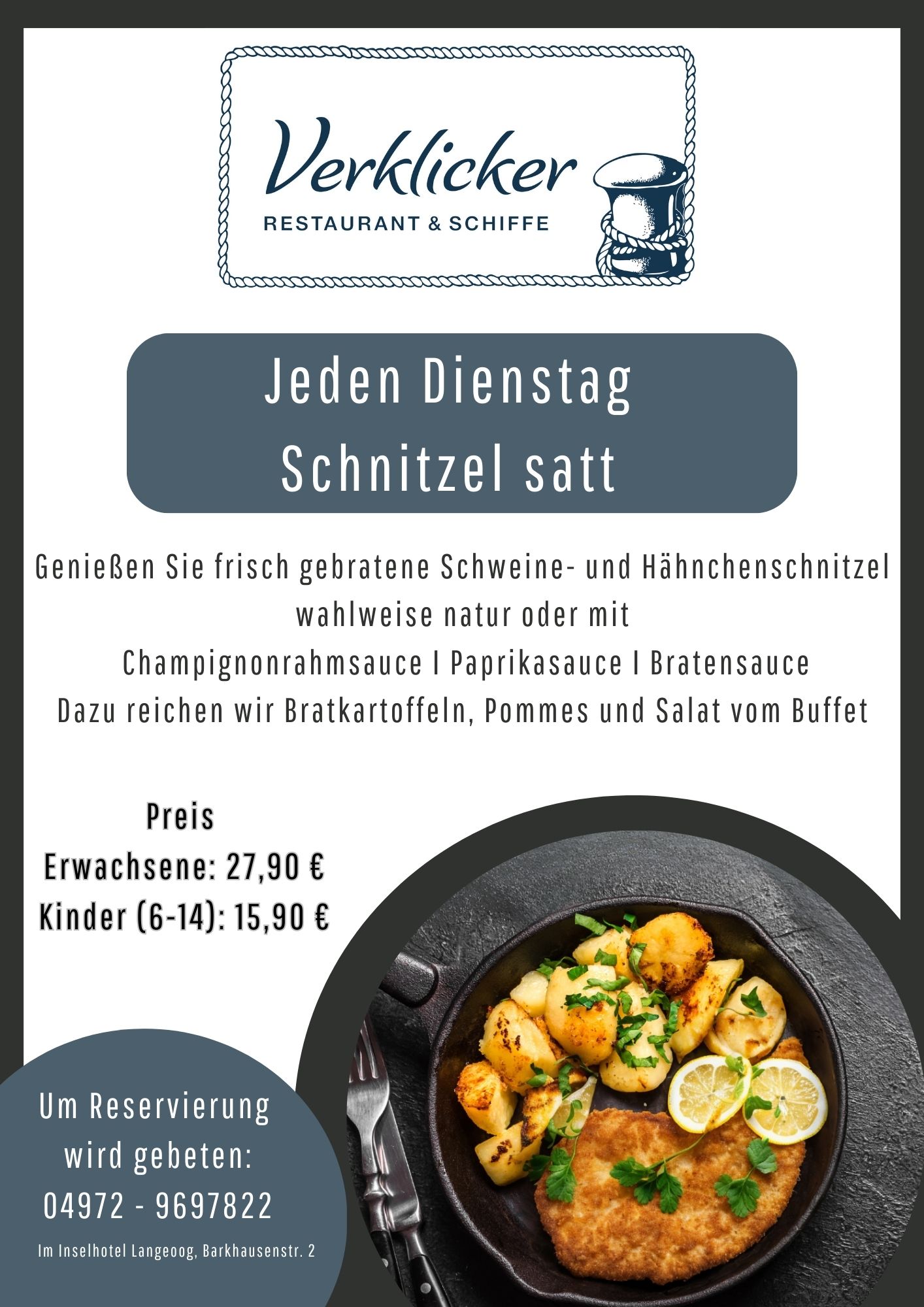 Unser Restaurant Verklicker hat Mittwochs Ruhetag und die Halbpension wird im Restaurant ANNO1828 in unserem Schwesternhotel Logierhus Langeoog serviert.